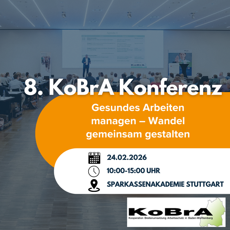 Unter dem Motto „Gesundes Arbeiten managen – Wandel gemeinsam gestalten“ lädt die „Kooperation Breitenumsetzung von Arbeitsschutz in der Pflege“ (KoBrA BW), unter Federführung der Unfallversicherungsträger BGW und UKBW und der AOK Baden-Württemberg, zur 8. KoBrA-Konferenz ein. Die Fachveranstaltung findet am Dienstag, 24. Februar 2026, von 10:00 bis 15:00 Uhr in der Sparkassenakademie Stuttgart statt.