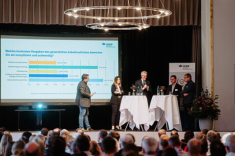 Im Mittelpunkt standen die neuen UKBW-Umfrageergebnisse, die zentrale Entwicklungspotenziale des Arbeitsschutzes aufzeigten: Umfangreiche Vorgaben, eine hohe Regeldichte und ein zunehmender administrativer Aufwand stellen viele öffentliche Einrichtungen beim Arbeitsschutz vor Herausforderungen. Im Rahmen der Talkrunde diskutierten die Teilnehmenden, wie Bürokratie gezielt abgebaut, Prozesse verschlankt und eigenverantwortlicher Handlungsspielraum für Verantwortliche genutzt werden können – immer mit dem Ziel, Arbeitsschutz wirksam, einfach und nah an der Realität zum Wohl der Beschäftigten zu gestalten.
